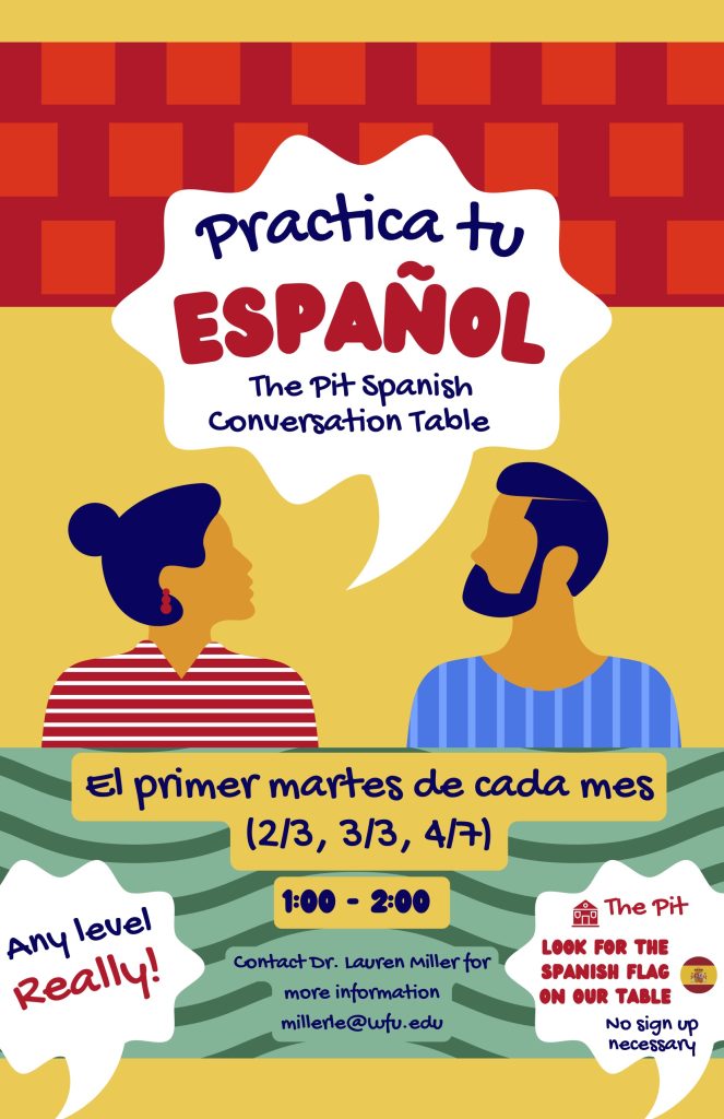 Spring 2026 Tertulia will meet on the first Tuesday of the month from 1-2 PM in The Pit. Look for the table marked with the Spanish flag and join anytime during the hour! Professor César Gutiérrez, Professor Lauren Miller, and Professor Daniel Jung will host Tertulia on the following dates: